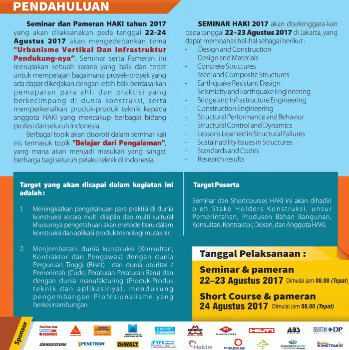 Dua hari pertama dari acara tersebut, yaitu tanggal 22 dan 23 Agustus 2017 diperuntukkan untuk seminar, yang biasanya akan diisi oleh para ahli atau pelaku konstruksi untuk berbagi dalam hal pengalaman dan ilmu pengetahuan baru yang diperolehnya. Oleh sebab itu, mengikuti acara seminar ini hukumnya adalah wajib bagi anak-anak muda pelaku di dunia konstruksi yang ingin lebih berkembang dalam karirnya. O ya, detail acara untuk seminar tersebut adalah :