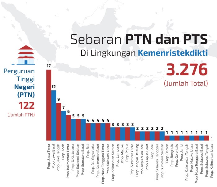 Dunia militer dikenal masyarakat karena keberadaannya dijumpai di setiap pelosok tanah air, bahkan daerah terpencilpun. Adapun dunia perguruan tinggi tidak demikian, mayoritas masih berkumpul di pulau Jawa. Info grafis dari PDDikti berikut sangat membantu.