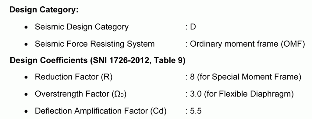 Seperti biasa, untuk mengevaluasi sistem struktur secara keseluruhan maka saya perlu melihat juga laporan perhitungan struktur. Nah ketemu deh bagaimana mereka (perencana) menetapkan nilai R untuk sistem struktur bajanya. Ini saya kutip dari laporan yang mereka buat.