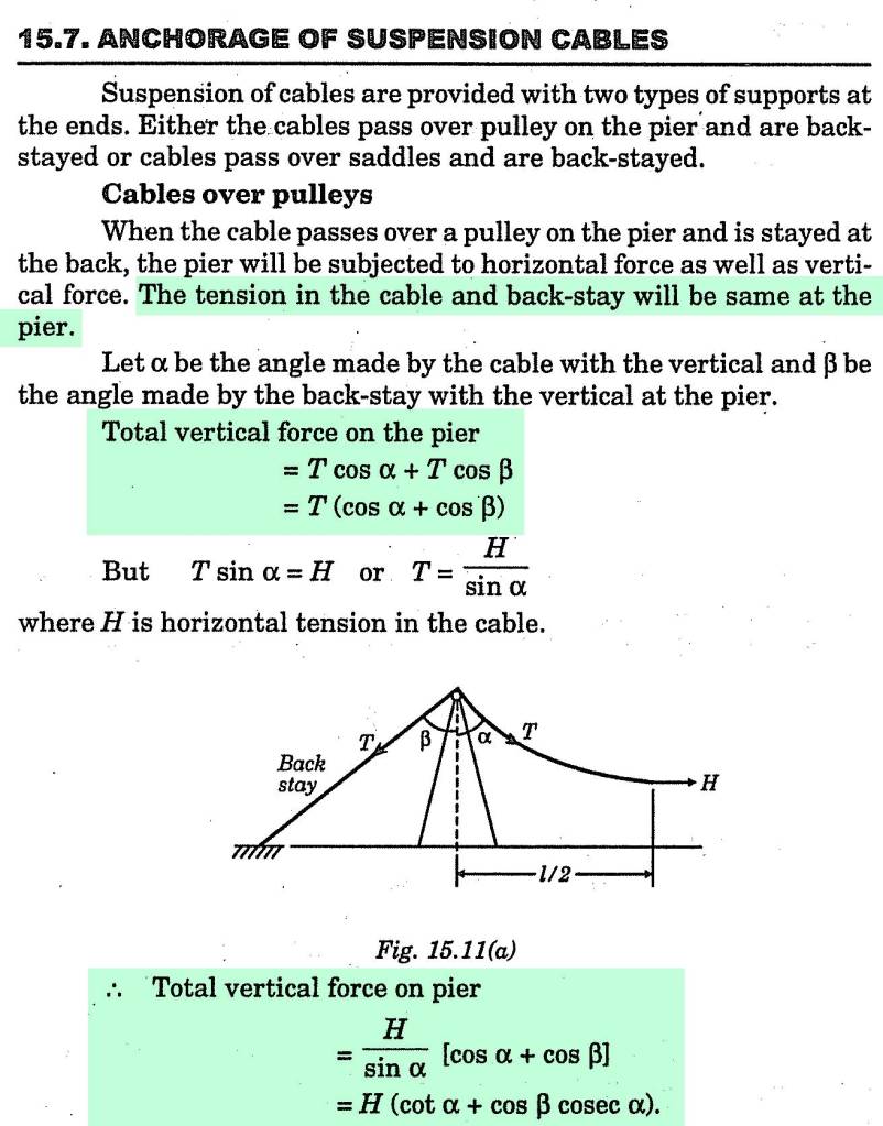 Penjelasan berikut dari buku Prof Vazirani adalah tentang gaya-gaya reaksi di pier jembatan gantung. Materinya menurut saya jarang ditemukan di buku-buku tentang struktur kabel atau jembatan gantung, terbitan Eropa atau Amerika. Teman saya yang berbeda pendapat, kelihatannya merujuk buku terbitan India, meskipun bukan buku yang saya bahas ini. Saya pikir karena sama-sama India maka hasilnya tentu mirip-mirip juga. Ini materi yang aku anggap membingungkan, tetapi telah digunakan oleh banyak ahli di Indonesia. Karena aku belum sependapat, maka aku buat saja sebagai artikel untuk dipikirkan. Benar nggak sih keraguanku tersebut.