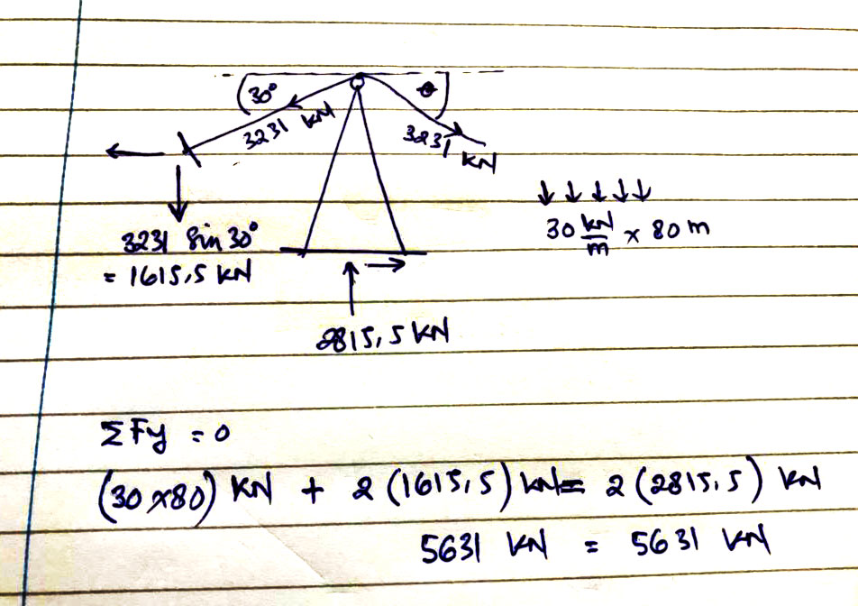 Gambar free-body di atas ingin menunjukkan kesetimbangan gaya-gaya pada kabel dengan parameter berdasarkan soal di buku Prof. Vazirani. Dari gambar dapat dilihat kesetimbangan secara menyeluruh, dimana ujung kabel back-stayed yang sebelah kiri tentunya akan ditahan blok pondasi. Rumus Prof Vazirani pada artikel di atas diragukan karena saya hanya meninjau kesetimbangan titik nodal ujung atas pier, yang bersifat lokal, dan melupakan adanya gaya aksi pada ujung kabel (blok pondasi angkur). Pada ujung kabel tersebut akan timbul komponen gaya vertikal, sehingga blok angkur harus berat agar tidak terangkat.