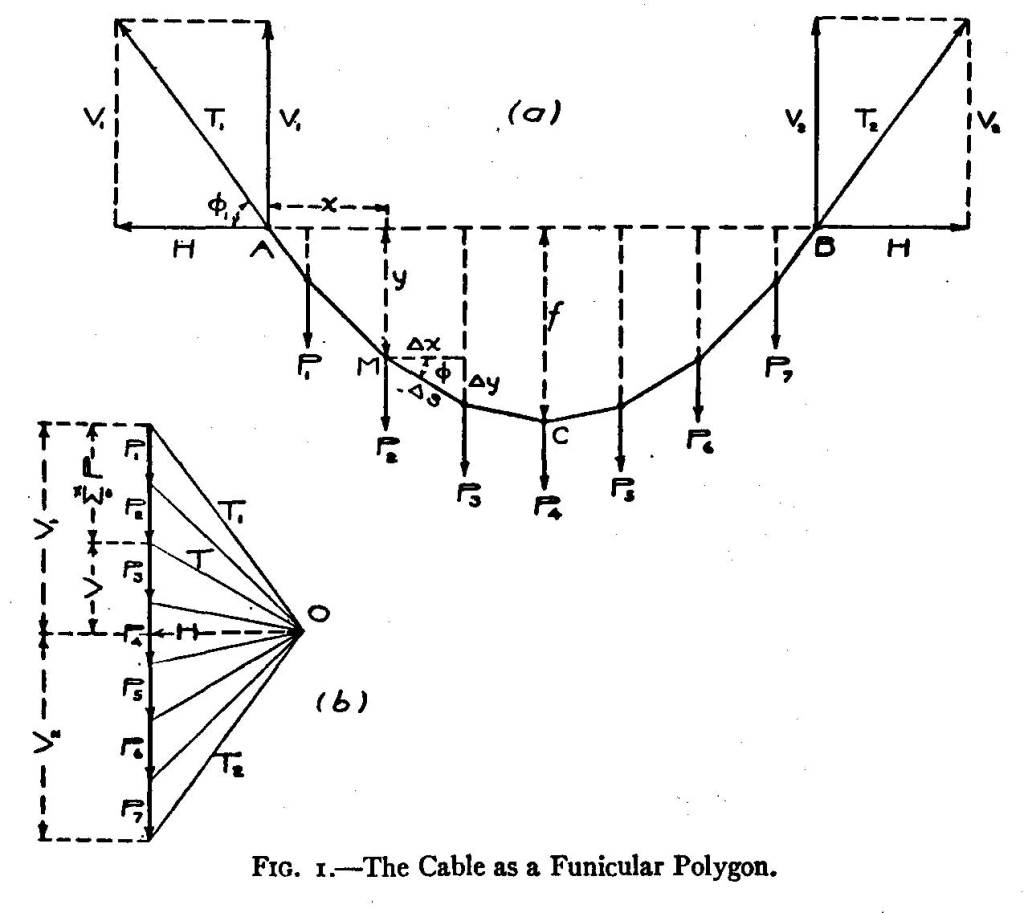 Itu diambil dari bukunya Steinman (jika tertarik silahkan download di sini), yang merupakan buku klasik tentang jembatan gantung. Gambar di atas bisa mengungkapkan keseimbangan gaya secara grafis. Bagian kabel back stayed tidak perlu ditinjau. Itu juga menunjukkan bahwa konfigurasi kabel back stayed tidak akan mengubah gaya-gaya reaksi pada tumpuan kabel, yang notabene adalah titik puncak pier dari jembatan gantung. Sampai disini semua teori jembatan gantung, dapat dipahami. Semua bisa dijelaskan secara rasional.