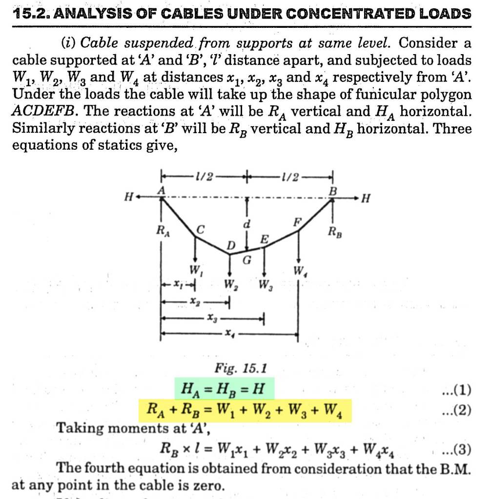 Dari uraian di atas bisa dipahami bahwa gaya-gaya yang bekerja pada struktur kabel, adalah sama seperti yang terjadi pada struktur yang lainnya, yaitu harus memenuhi persamaan keseimbangan. Itu berarti jumlah kumulatif gaya-gaya reaksi ditambah gaya-gaya aksi adalah NOL, baik arah vertikal maupun horizontal. Di atas hal itu ditulis sebagai gaya reaksi (RA + RB) arah ke atas adalah sama dengan gaya aksi (W1+W2+W3+W4), yang arahnya ke bawah. Berat kabel tentunya di abaikan.