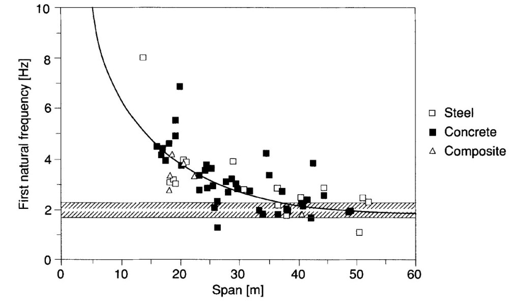Permasalahan terkait karakter dinamik seperti ini ternyata banyak juga dijumpai pada jembatan pejalan kaki yang lain. Tidak hanya jembatan dengan kabel, juga jembatan dengan balok beton bertulang menerus atau dari struktur baja. Dari ± 67 jembatan pejalan kaki dari berbagai tempat di dunia, diukur frekuensi alami dan bentangnya. Selanjutnya dibuat grafik hubungan keduanya, sekaligus batas frekuensi alami pejalan kakinya. Ternyata untuk bentang jembatan pejalan kaki lebih dari 30 m maka frekuensi alaminya mendekati frekuensi alami pejalan kaki, yang berarti risiko terjadinya resonansi besar sekali. Kata lain dari kondisi jembatan yang tidak nyaman untuk dipakai.