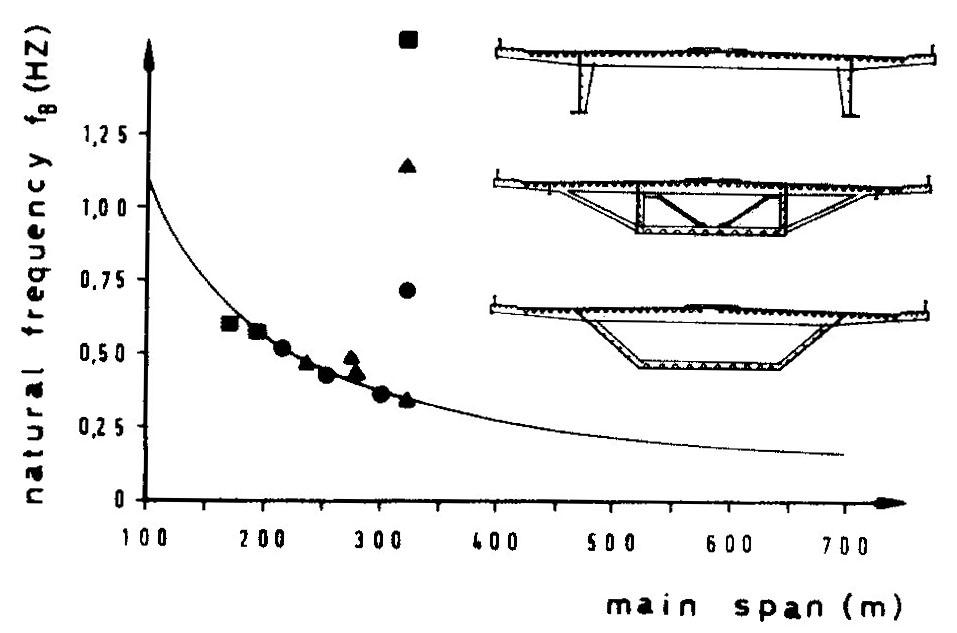 Gambar 1. Frekuensi alami jembatan cable-stayed (Aschrafi dan Hirsch 1983)